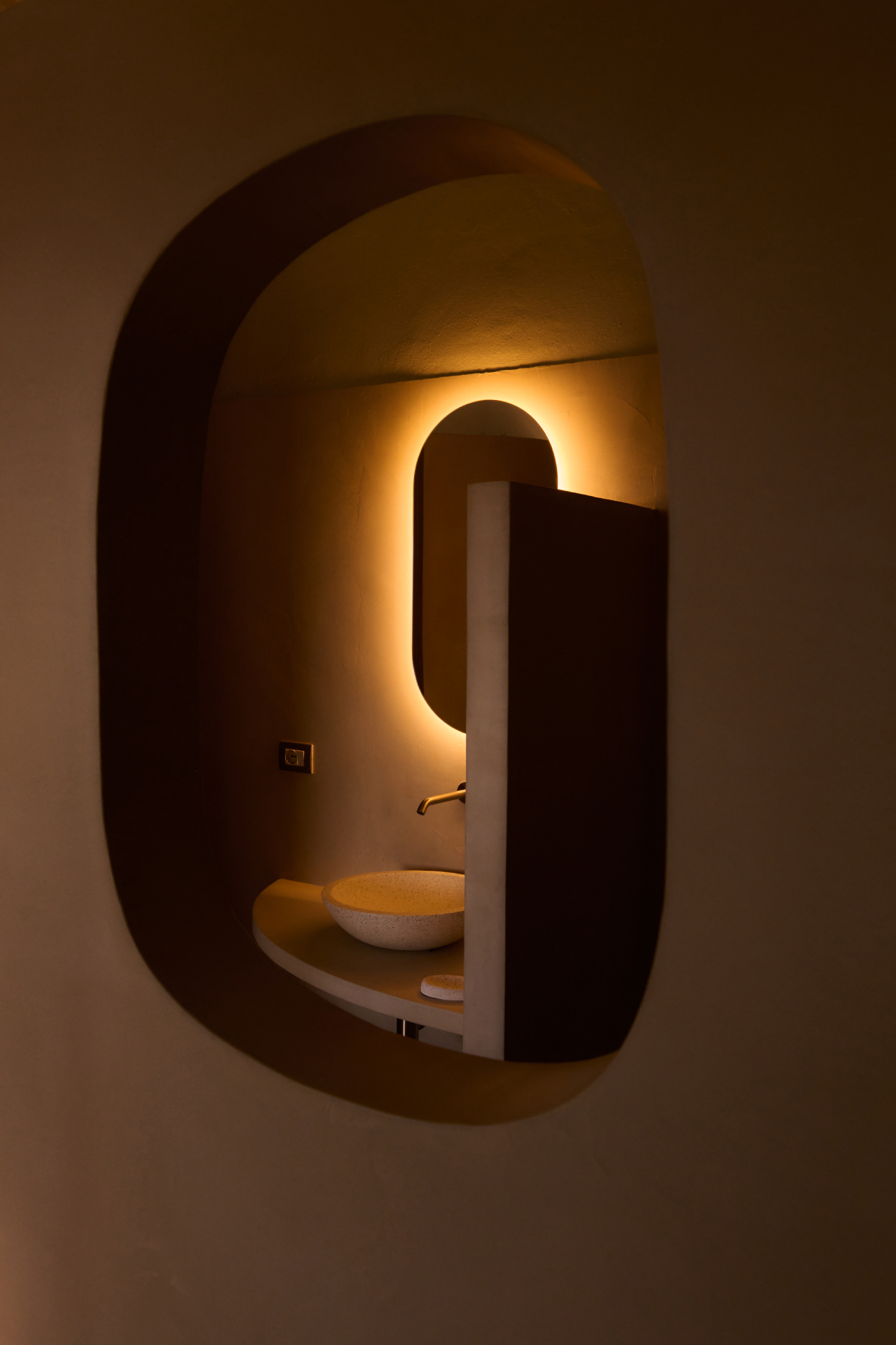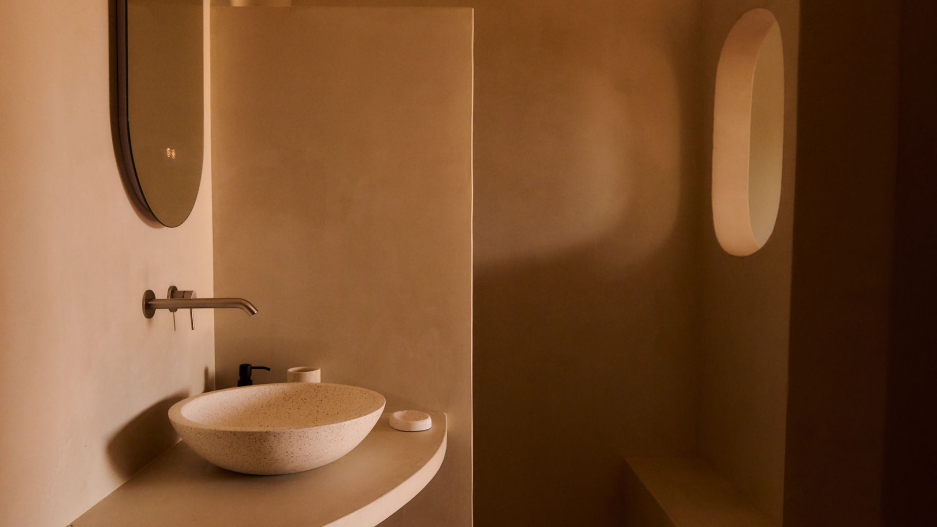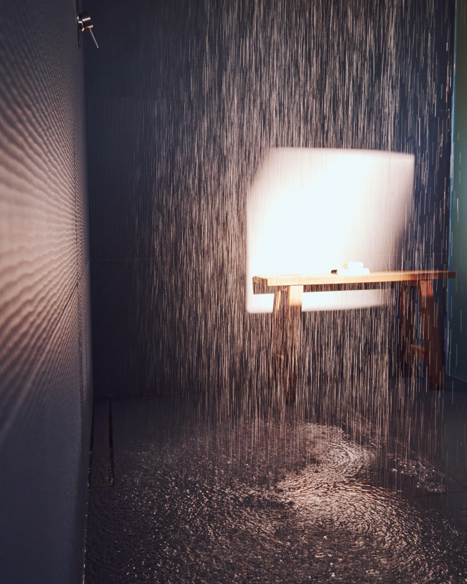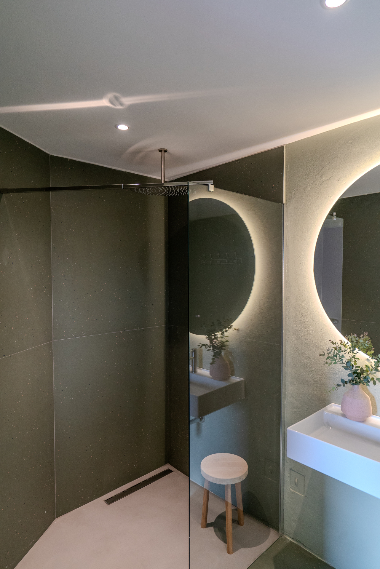 A standalone living space/relaxation area including a large bathroom with a shower + dressing table
