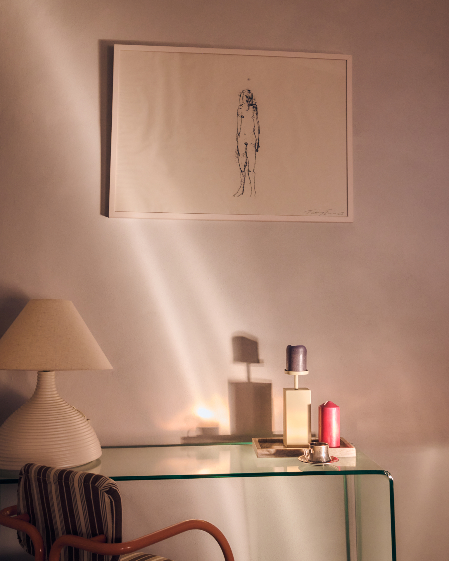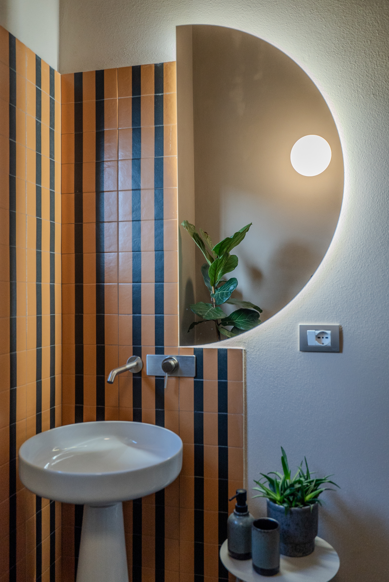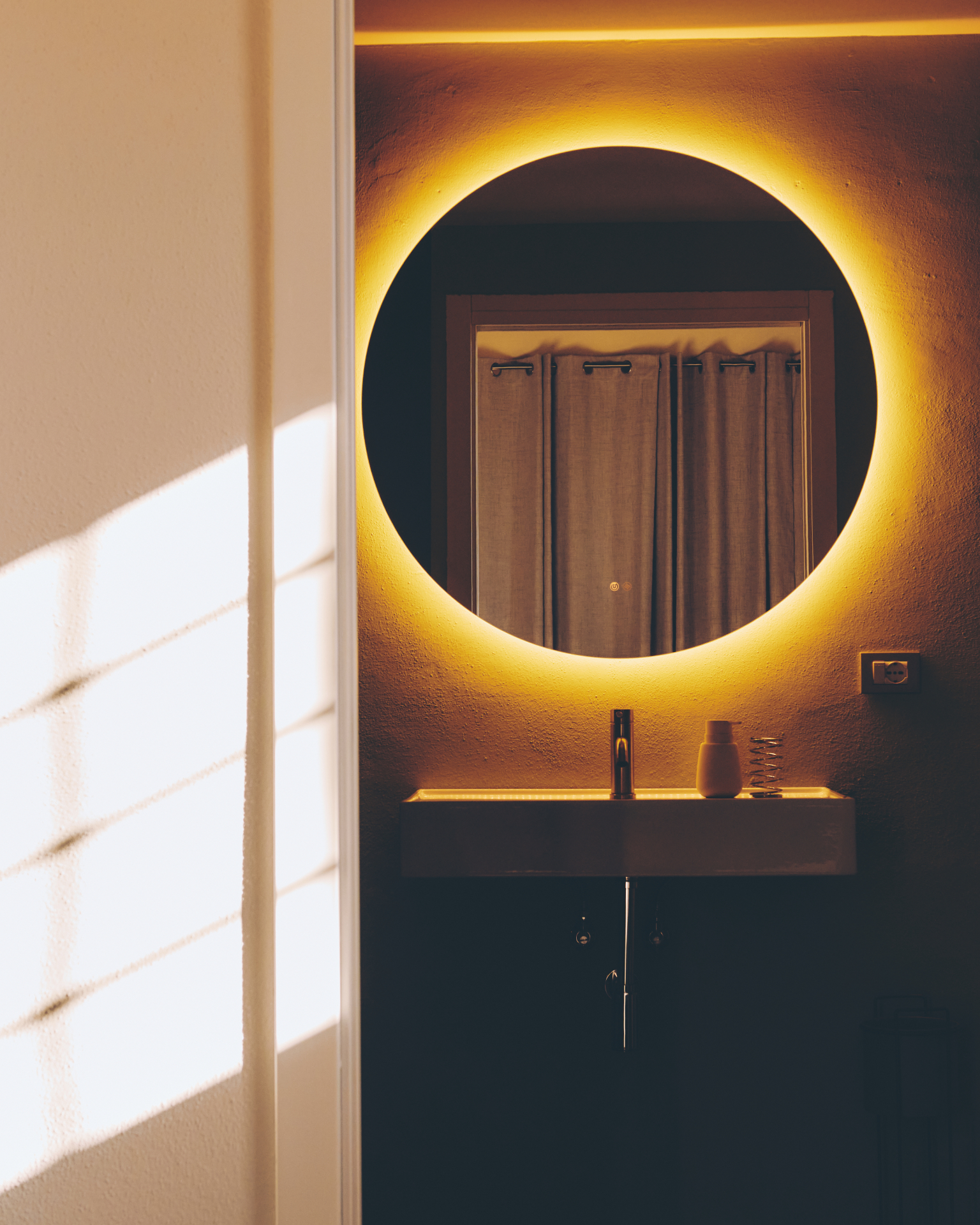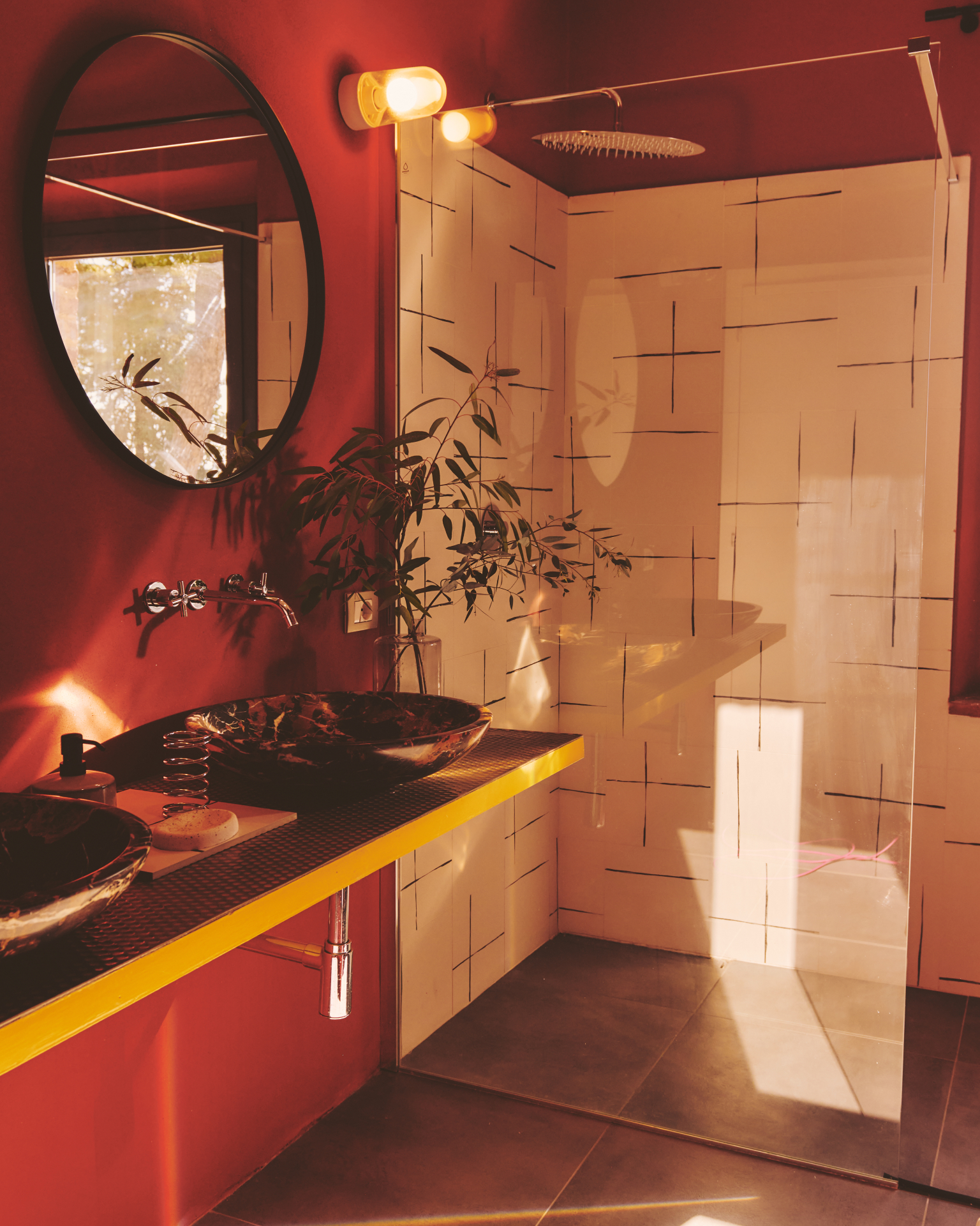 A standalone living space/relaxation area including a large bathroom with a shower + dressing table